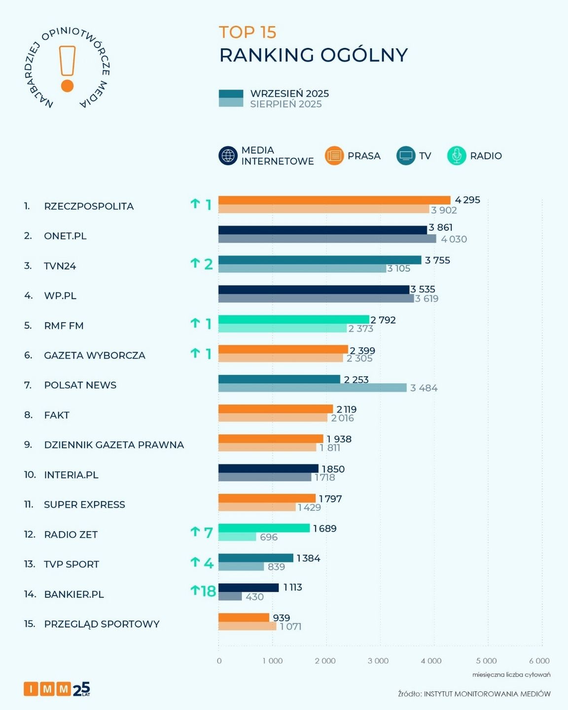 Podium zamknęła stacja TVN24 z niemal 3,8 tysiąca odniesieniami. Telewizja zawdzięcza wysoką pozycję rozmowom z kluczowymi politykami. W przypadku tytułów prasowych za „Rzeczpospolitą” uplasowały się „Gazeta Wyborcza” z 2,4 tysiąca cytowań oraz „Fakt” z ponad 2,1 tysiąca odniesień. Ten ostatni opublikował głośny wywiad z prezydentem Karolem Nawrockim dotyczący kontrowersyjnych wypowiedzi ukraińskiego przywódcy.